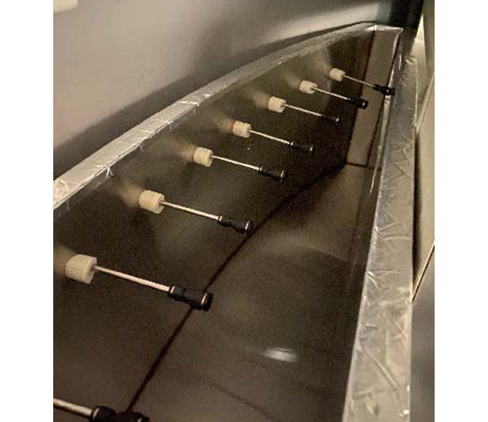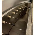 2枚目の写真のように曲面の壁と奥のプレハブ冷蔵庫の間には楕円形の隙間がありそこをそのまま繋ぎこむとロスが大きいので、二重のステンレスの楕円箱を製作し(内部断熱済)、プレハブ冷蔵庫の冷気をブロアファンでこの箱の中まで満たし、ギリギリまで冷蔵ラインを保てるように致しました。