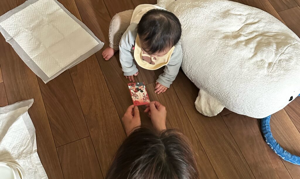 写真は孫にお年玉をあげるウチの奥さん。10ヶ月の子なので、これがこの子の人生初のお年玉。