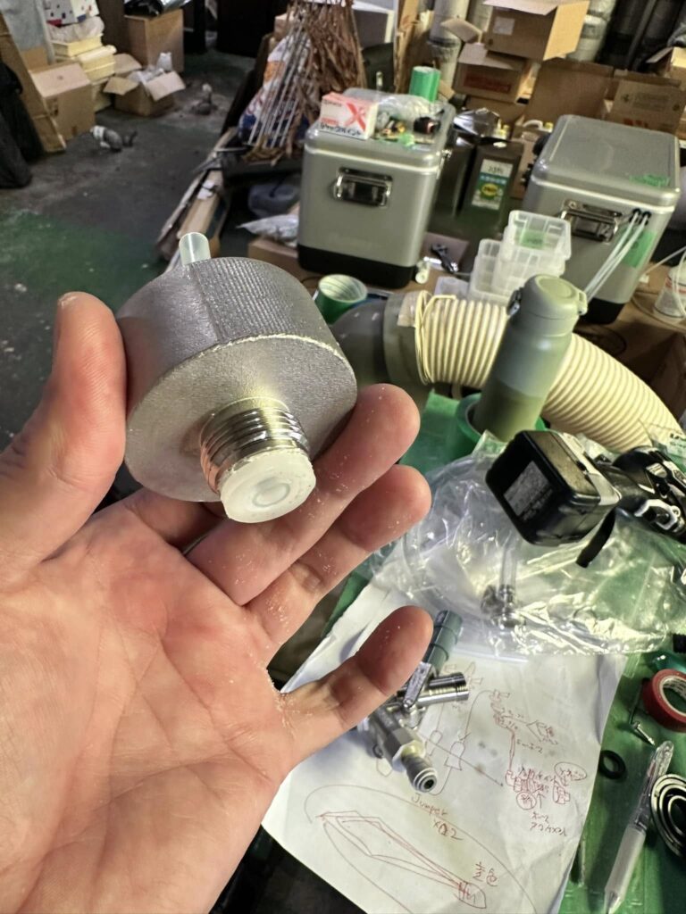 今のところひとつだけのオリジナルの部品の完成だぜ。これ取り付けると、フォーセット側から水道ホース突っ込んで蛇口捻ったら逆流させて水通しが出来るのでめちゃくちゃ便利かも知れません。