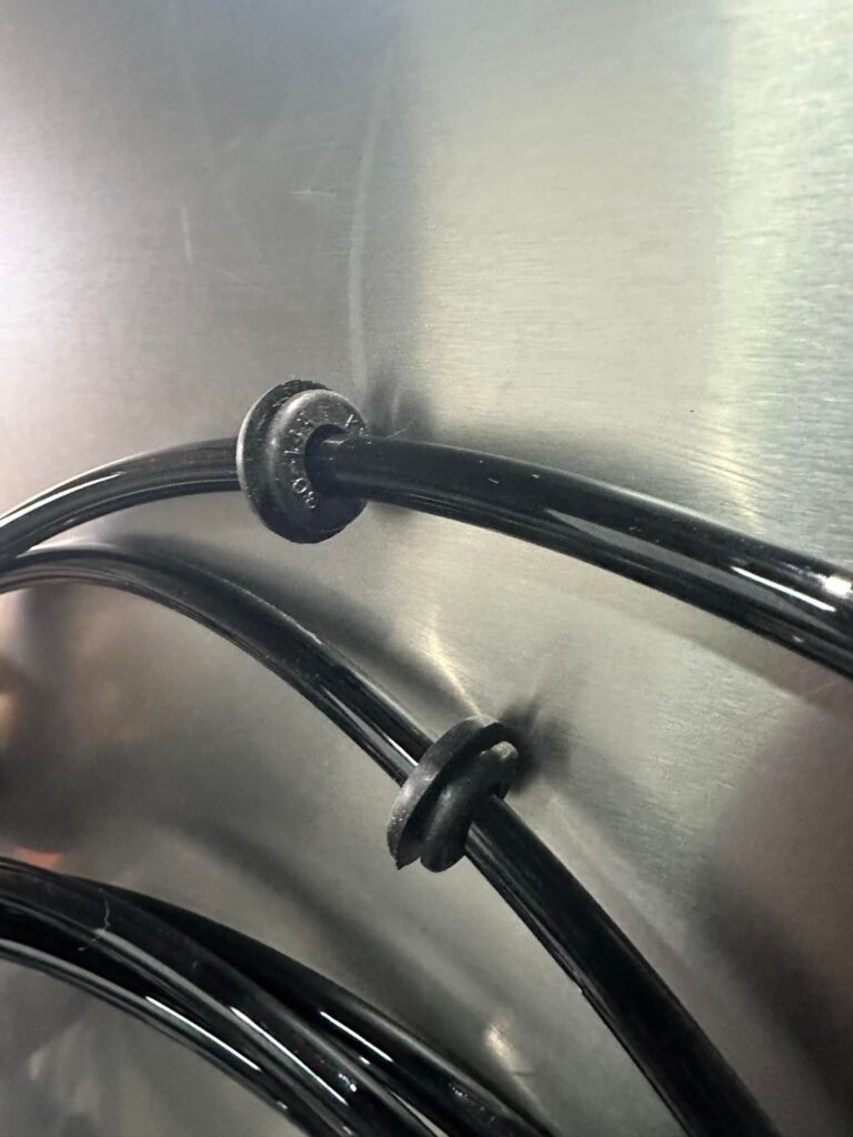 ・ガスライン用孔 15mmφ(ガスラインは8mmですが直接差し込むと孔の周りのバリでホースが傷付くので、14mmのグロメットを使う為です、写真参照)