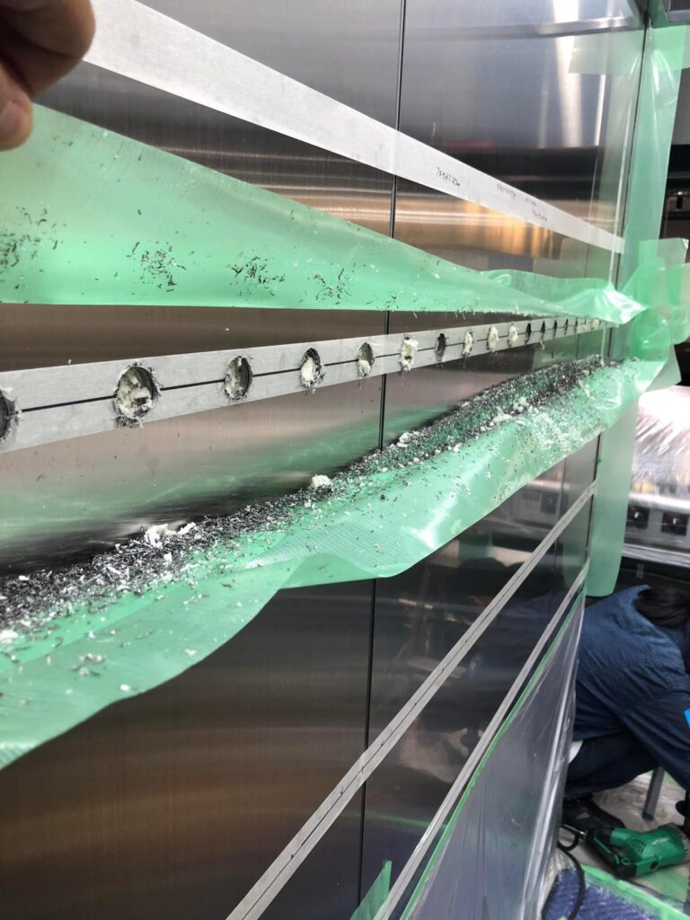 写真の通りです。ステンレスに穴を開けるのでともかく切粉がめちゃくちゃ出ます、養生テープで周りを囲ってから作業しないととんでもない範囲に飛び散ります。